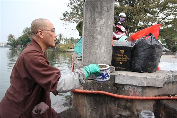 Được biết vị sư phụ này đã liên tục làm công việc giữ vệ sinh mỗi dịp ông Công, ông Táo ở Hồ Tây đã 7 năm nay.