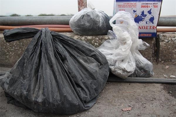 Sau khi đổ tro hoá vàng ra sông, các tình nguyên viên đứng sẵn trên bờ để thu gom túi nilon.