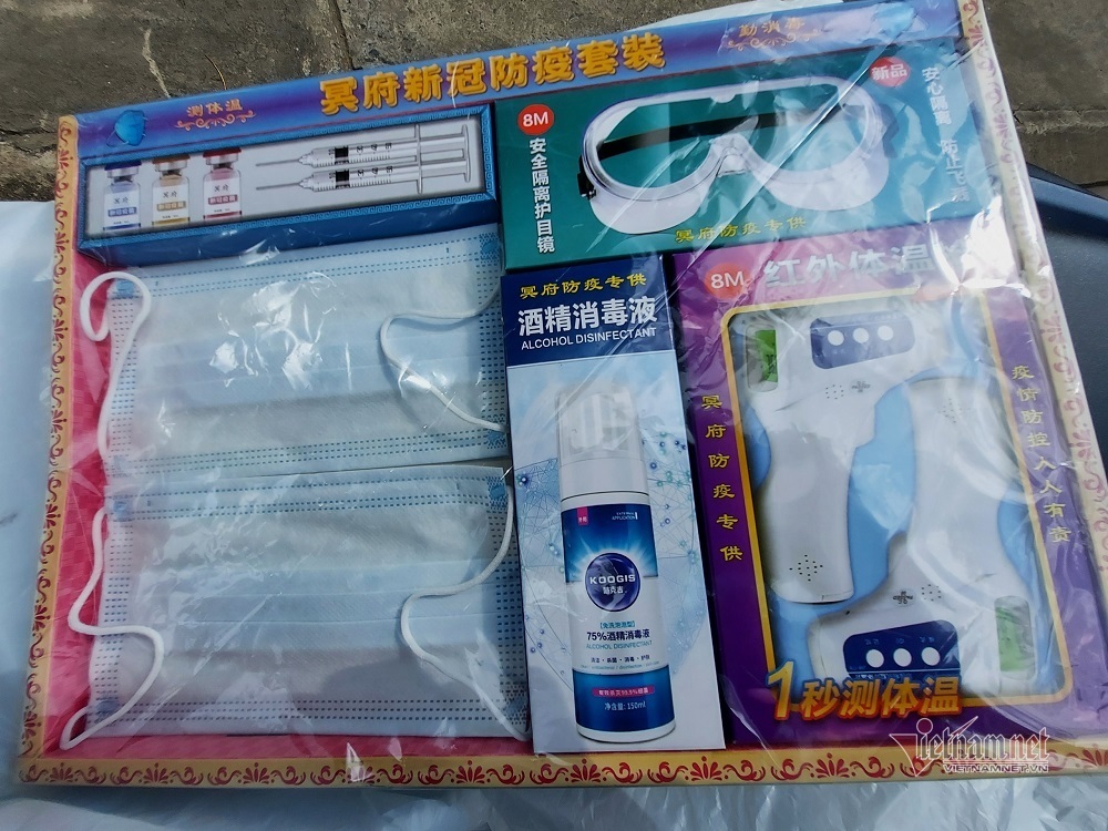 Đáng chú ý, vàng mã năm 2022 có thêm mô phỏng hình vắc xin phòng Covid-19, khẩu trang, thuốc xịt khuẩn và đồ bảo hộ chống dịch đi kèm trong một bộ. Sản phẩm vàng mã trên được bán với mức giá 25.000 đồng/bộ.