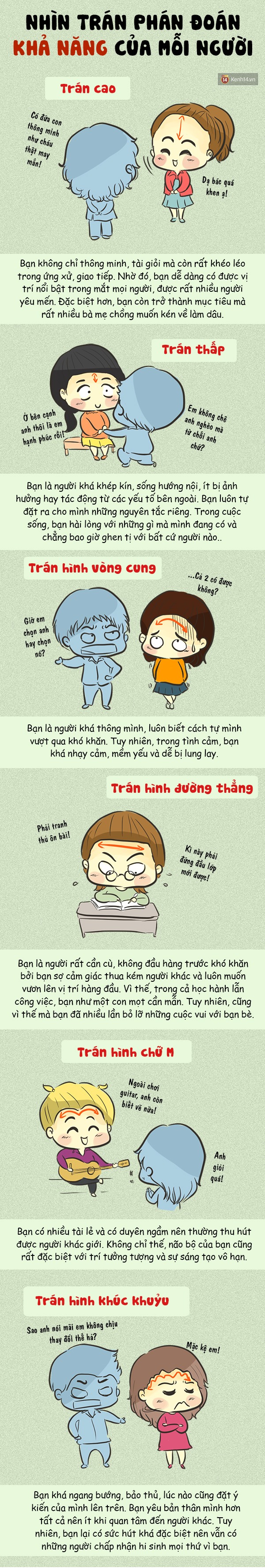Trán là phần nằm phía trên và hơi nhô ra phía trước đầu. Nó được đánh dấu bằng đường tóc mọc. Chính điều này đã tạo nên cho mỗi người một hình dạng trán khác nhau. Hãy cùng "bắt hình" trán để phán đoán về khả năng của một người nhé!