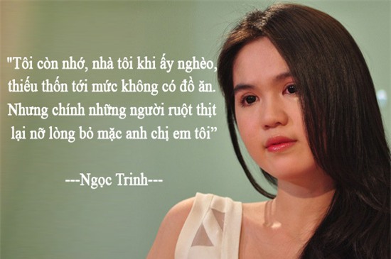 Ngọc Trinh kể: "Tôi còn nhớ, nhà tôi khi ấy nghèo, thiếu thốn tới mức không có đồ ăn. Nhưng chính những người ruột thịt lại nỡ lòng bỏ mặc anh chị em tôi. Họ cho đồ ăn hàng xóm chứ nhất định không cho chúng tôi. Cho nên đến bây giờ dù họ có chết, cần tiền tôi cũng không giúp. Cùng lắm chỉ mủi lòng 1-2 lần, lần thứ 3 tôi không quan tâm".