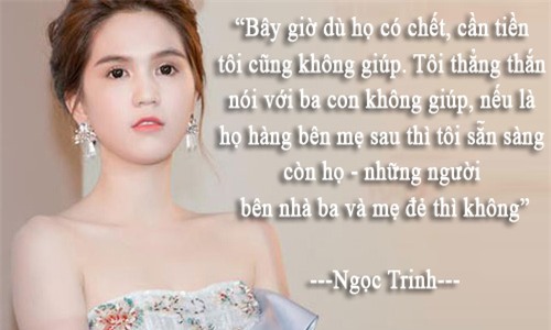 lạnh. Trong một bài phỏng vấn năm 2015, mỹ nhân xinh đẹp giàu có - Ngọc Trinh khiến ai nấy đều ngỡ ngàng khi công khai tuyên bố "dù những người trong họ hàng có chết, cần tiền tôi cũng không giúp".