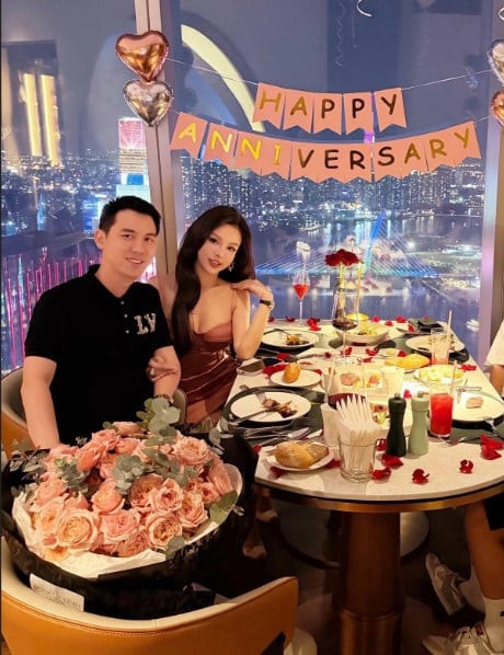 Hôm 9/4, Huyền Baby cùng ông xã - doanh nhân Quang Huy - đi ăn tối tại một nhà hàng trên cao ở TP HCM nhân kỷ niệm 13 năm cưới và 15 năm gắn bó. Trong buổi hẹn hò lãng mạn, "chị đẹp" 37 tuổi đeo nhẫn kim cương "khổng lồ" và đồng hồ kim cương lấp lánh.