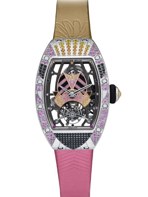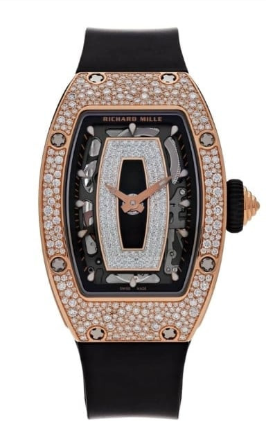 Thiết kế RM 07-01 Ladies Rose Gold Onyx Snow Diamond Set của Richard Mille có phần vỏ làm từ vàng hồng 18K, mặt số đá onyx được tô điểm bằng những viên kim cương đính thủ công tinh xảo, tạo hiệu ứng lấp lánh như tuyết. Món phụ kiện được rao giá 350.000 USD (hơn 9,2 tỷ đồng) trên Wrist Aficionado.