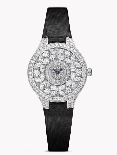 Thiết kế Classic Butterfly cỡ 33 mm từ thương hiệu Graff tiêu tốn 153.000 USD (hơn 4 tỷ đồng). Đồng hồ được chế tác tinh xảo từ vàng trắng, nạm kim cương theo hình cánh bướm đối xứng, sử dụng dây đeo satin đen và trang bị bộ máy quartz.