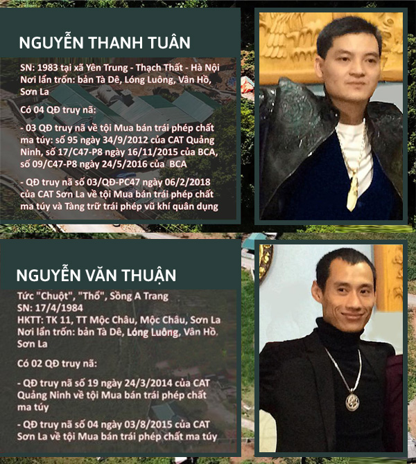 Nổi lên là bản Lũng Xá và Tà Dê (xã Lóng Luông), trong đó có 2 đối tượng truy nã đặc biệt nguy hiểm cầm đầu là Nguyễn Thanh Tuân (35 tuổi, trú tại thôn Lặt, Yên Trung, huyện Thạch Thất, TP Hà Nội), có 4 quyết định truy nã về tội mua bán trái phép chất ma túy và tàng trữ trái phép vũ khí quân dụng; Nguyễn Văn Thuận (34 tuổi, tức Thuận “chột”, Thổ, tên khác là Sồng A Trang, quê ở huyện Thanh Liêm, tỉnh Hà Nam; hộ khẩu thường trú tại huyện Mộc Châu), có 2 quyết định truy nã về tội mua bán trái phép chất ma túy.