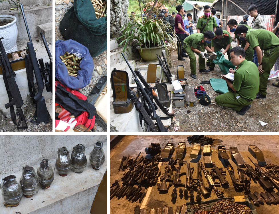 Phía ngoài 3 cửa ra vào được Tuân dùng các khối gỗ, bao xi măng che chắn. Theo tay chỉ của đồng chí trinh sát, ngay phía trong góc hầm, lực lượng công an thu giữ hàng chục khẩu súng các loại, hàng nghìn viên đạn, gần chục quả lựu đạn và lương thực mà các đối tượng đã tích trữ sẵn với ý đồ cố thủ chống trả lại lực lượng truy bắt.