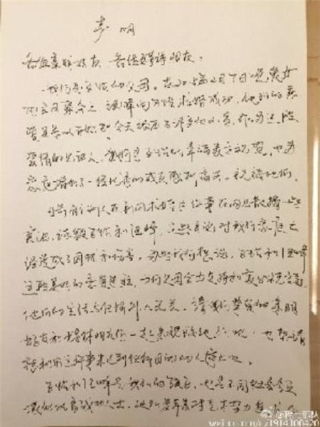 Bức thư của cha mẹ Chương Tử Di được cô tải lên trang blog của mình. |