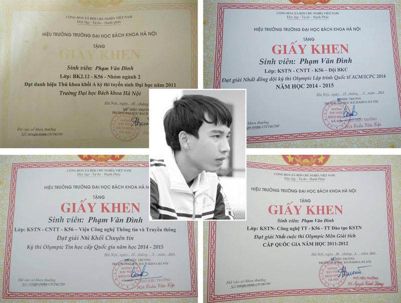 Phạm Văn Đình đỗ thủ khoa khối A Trường ĐH Bách khoa Hà Nội kỳ thi năm 2011 với 29 điểm với Toán đạt 9,5, Lý đạt 9,75 và Hóa đạt 9,5.