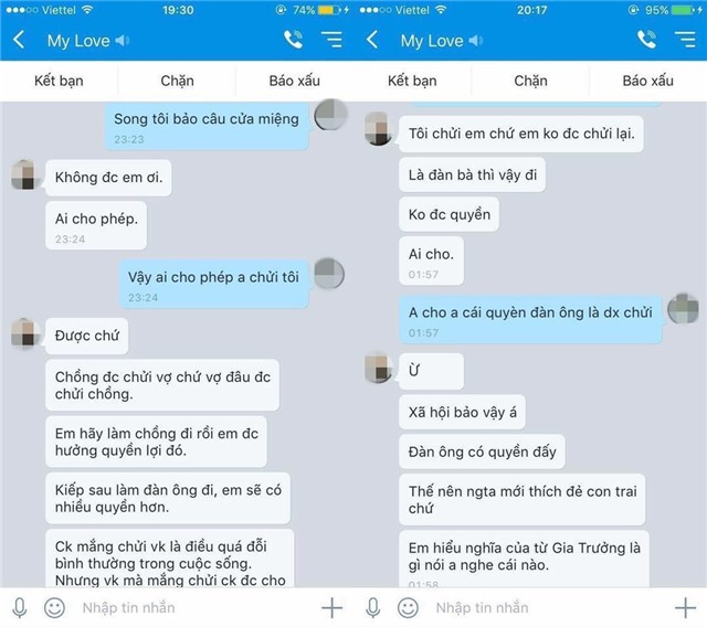 Anh chửi mình thì mình nhịn cho qua được chứ cha mẹ mình không làm gì anh, mà anh chửi cả gia đình mình. Mình tranh luận thì anh bảo không được cãi chỉ có đàn ông mới được chửi và làm vợ thì phải nghe muốn chửi muốn cãi thì kiếp sau làm đàn ông đi.