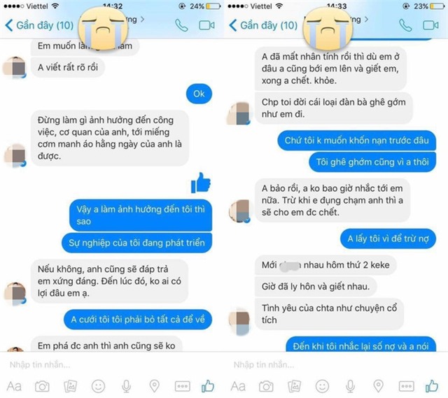 Anh còn dọa mình nếu cô viết đơn nói rõ nguyên nhân chia tay và viết lên facebook sự thật thì anh sẽ giết. Mình không biết anh dọa thật làm thật hay chỉ là nhất thời đe dọa .