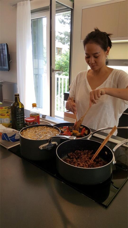 Thu Minh cùng chồng ngoại quốc tự tay vào bếp chuẩn bị đồ ăn tiếp đãi bạn bè tới chơi.