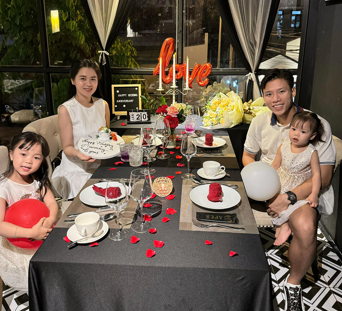 Hôm 20/1, Quế Ngọc Hải và bà xã Dương Thùy Phương kỷ niệm 7 năm ngày cưới. Trên trang cá nhân, trung vệ xứ Nghệ đăng tải hình ảnh hai vợ chồng mặc đồ đôi, tay nắm tay và nhắn gửi tới bà xã: 'Anh sẽ vẫn nhìn và yêu em như thế'.