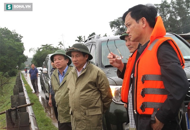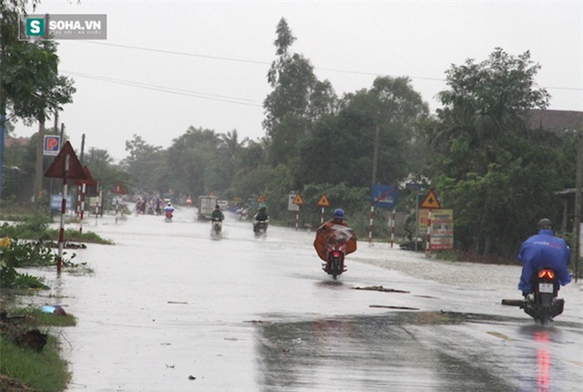 Rạng sáng 15/10, sau 1 ngày mưa to, nhiều huyện trên địa bàn tỉnh Hà Tĩnh bắt đầu ngập lụt. Nhiều nơi ngập sâu từ 2-3m. Trong ảnh là điểm bị nước nhấn chìm sâu hơn 50cm tại tỉnh lộ 3 (xã Thạch Đài, Thạch Hà, Hà Tĩnh). Thanh tra giao thông phải cắt cử người canh gác.