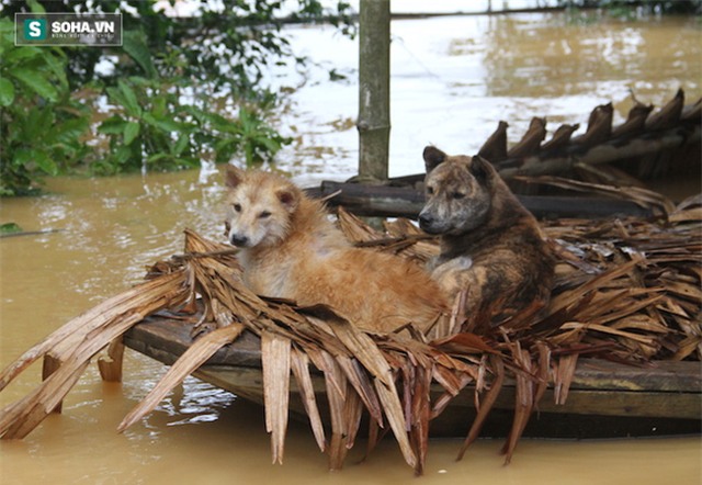 Những chú chó nhỏ cũng được gia đình mang theo chạy lũ.