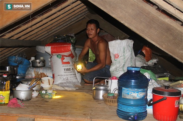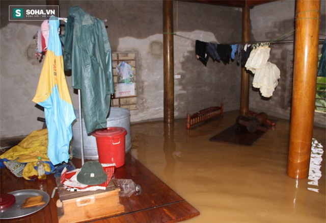 Nhà ngập sâu gần nửa, gia đình anh Nguyễn Văn Thiện (trú xóm Ấp Tiến, xã Phương Mỹ) đành dọn đồ đạc lên nóc nhà để làm nơi sinh hoạt tạm thời.