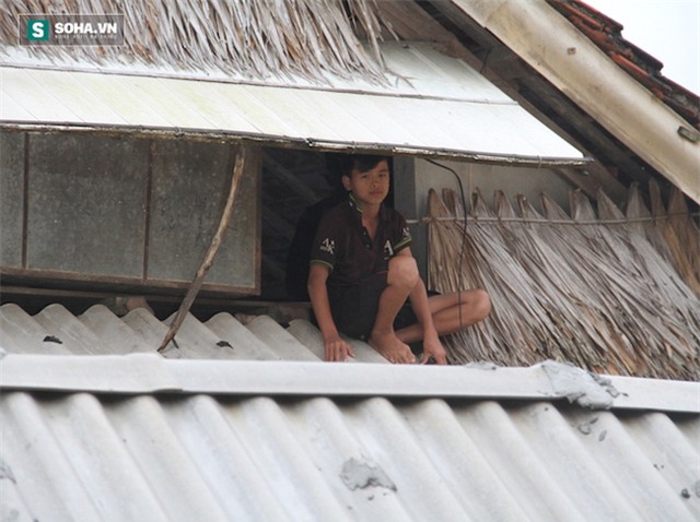 Một em học sinh ỏ xã Phương Mỹ (Hương Khê, Hà Tĩnh) ngồi trên mái ngói vì nhà đã bị ngập sâu gần 2m.