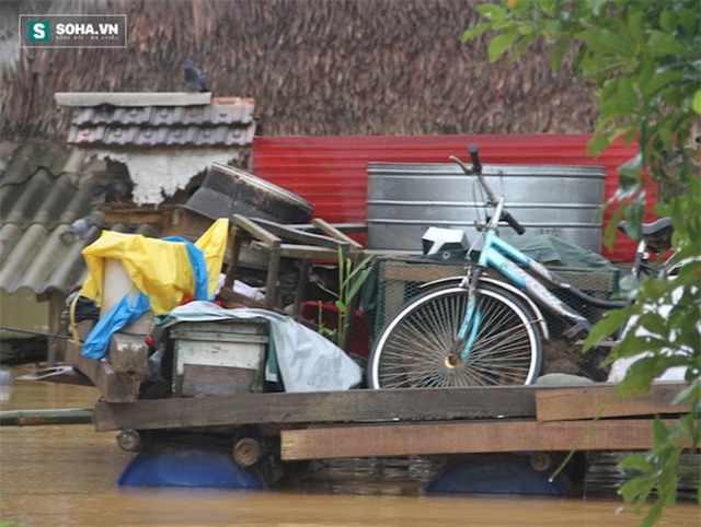 Từ xe đạp đến thùng đựng thóc đều được gia chủ để lên chiếc bè tự chế.