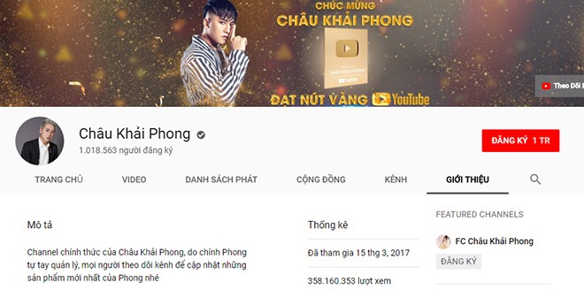 Đặc biệt, dù mới chỉ ra mắt đúng 2 năm, nhưng kênh youtube riêng của Châu Khải Phong đang nối bước Sơn Tùng M-TP, Bích Phương trở thành kênh youtube lớn nhất Việt Nam với hơn 1 triệu lượt theo dõi, hơn 358 lượt xem sau 1 năm và có hàng loạt sản phẩm từ chục đến trăm triệu view.