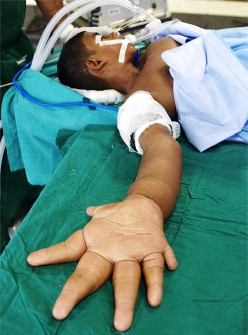 Theo tờ Mirror đưa tin, Kaleem đến từ Ấn Độ mắc phải dị tật hiếm gặp từ khi mới sinh khiến đôi bàn tay cậu bé to gấp đôi những đứa trẻ sơ sinh khác. Được biết, đây là căn bệnh Macrodactyly - phình đại ngón hay còn biết đến với tên gọi khác là dị tật bẩm sinh ở chi. Nguyên nhân gây ra chủ yếu do gene duy truyền, ốm đau trong thời kỳ thai nghén, do dùng thuốc, do nhiễm độc (dioxin…), nhưng đa số các trường hợp thì nguyên nhân không rõ ràng. Hiện nay trên thế giới tỷ lệ trẻ sơ sinh gặp phải trường hợp này là 1/500.