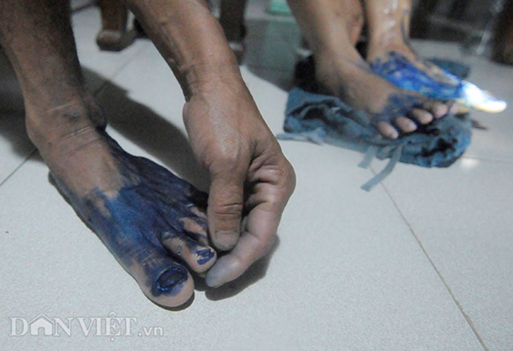 Những đầu móng chân của ông Nguyễn Tất Sáng (chồng bà Sáu) bị nước ăn không mọc được. "Năm nay, nước lũ đọng lâu, cả nhà ai cũng bị nước ăn chân, khổ nhất là bị tiêu chảy vì thiếu nước sạch và rau xanh” - ông Sáng nói.