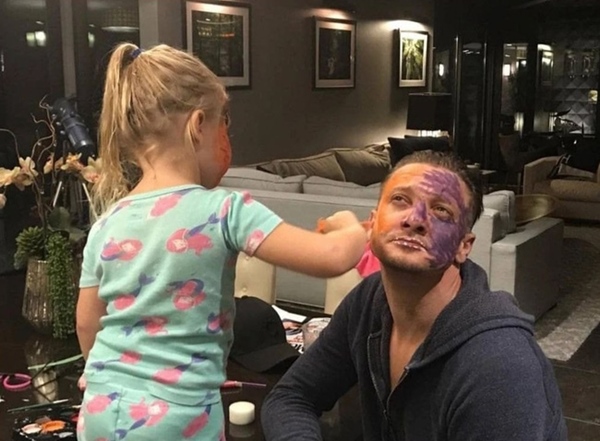 Trên phim là siêu anh hùng, ngoài đời Jeremy Renner trở thành người mẫu cho con gái tập trang điểm.