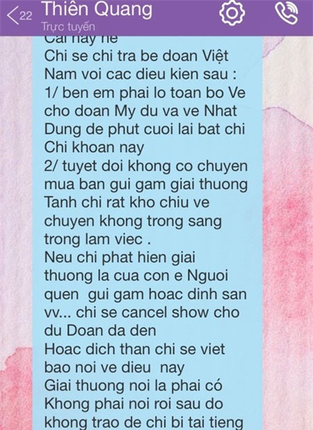 Đoạn tin nhắn bà Kim Giao gửi cho Thiên Quang - đại diện công ty Việt show Ent. |