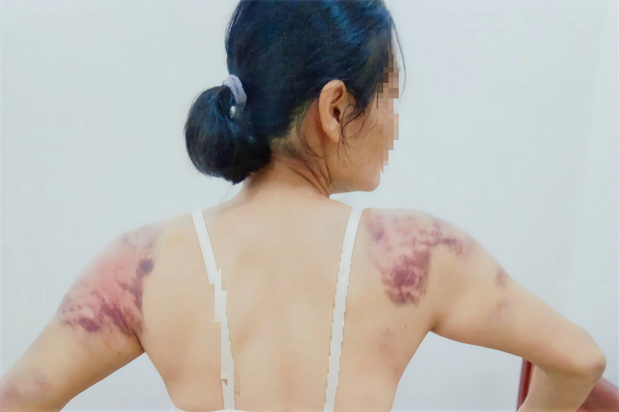 Một phụ nữ bị người mình từng hết lòng yêu thương đánh đến sưng, thâm tím vùng mông (Ảnh: Ngôi nhà Ánh Dương cung cấp).