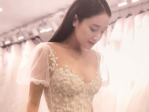 Nữ diễn viên diện váy cưới do Chung Thanh Phong thiết kế với phần tay bồng điệu đà và gắn đá cầu kỳ.