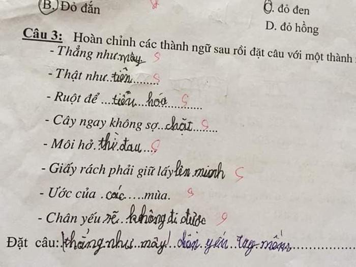 Hơn nữa, thành ngữ là những câu nói đã được lưu truyền qua ngàn đời nay từ ông cha ta, cho nên việc điền đúng là yêu cầu bắt buộc, không thể tự bịa hay sáng tạo. Trước đó, cũng có không ít bài tập điền từ những câu thành ngữ toàn là được 'chế' ra từ các bạn học sinh tiểu học khiến phụ huynh phải dở khóc dở cười.