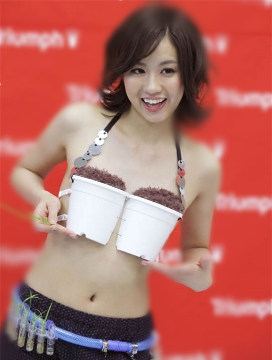 Áo lót kiêm luôn chậu cây kiểng, bên dưới có dây nịt đang ươm mầm cây còn non.