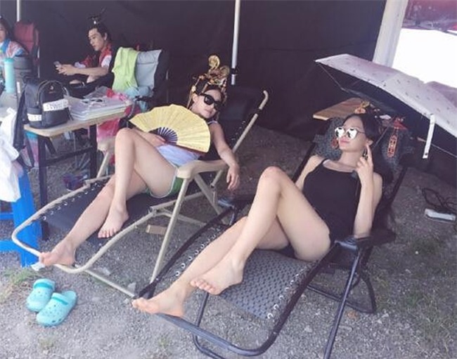 Quay phim cổ trang vào mùa hè là một “cực hình” với các diễn viên Hoa ngữ. Họ phải mặc trang phục được làm từ vải chất liệu dày và có nhiều lớp. Trong giờ giải lao, các diễn viên đều trút bỏ các loại phục trang dày và rườm rà để tránh nóng. Riêng các diễn viên nữ, họ chỉ giữ lại lớp tóc giả được thực hiện cầu kỳ với nhiều trâm cài và phụ kiện. Ảnh: Các mỹ nhân phim “Trùng nhĩ truyện” khoe chân dài trong giờ giải lao.