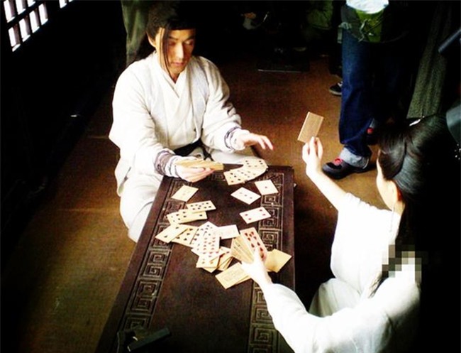 Với những diễn viên có cảnh quay ở trong hoàng cung, việc tránh nóng có phần đơn giản hơn. Để “giết” thời gian, Hồ Ca và Bạch Băng cùng chơi bài ở hậu trường phim “Thần thoại”.