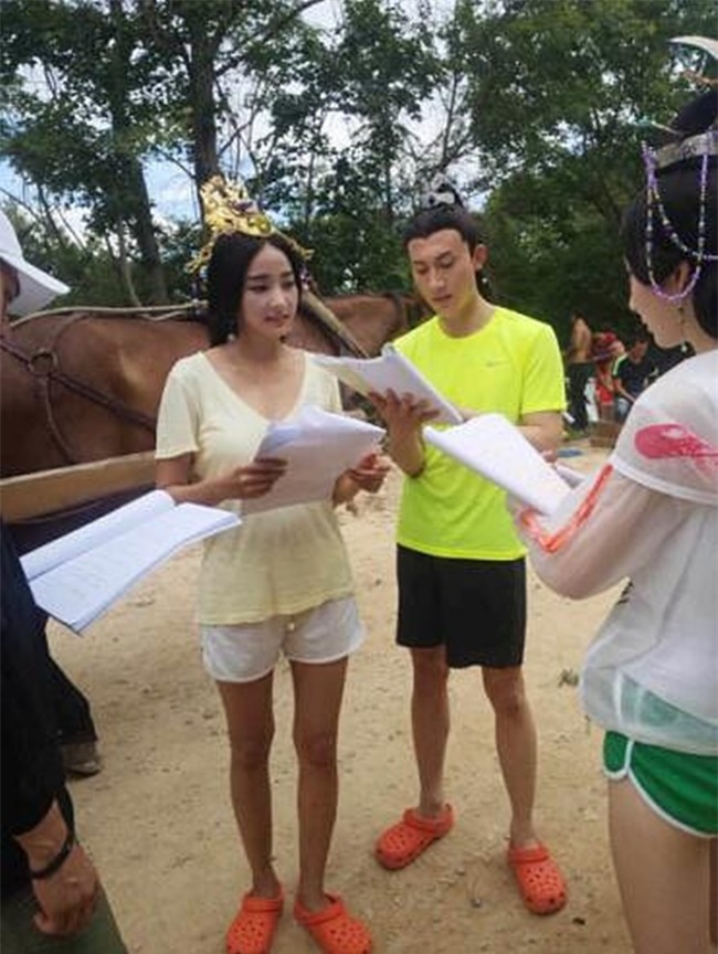 Tề Khương (Trương Hàm Vận) và Tấn Văn Công Trùng Nhĩ (Vương Long Hoa) diện quần short, áo thun cùng thảo luận kịch bản với đạo diễn.