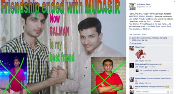 Anh chàng có tên Asif Rasa Rana, hiện ngụ tại Gujranwala, Pakistan đã lên mạng xã hội đăng đàn thông báo, rằng người "cựu bạn thân" của mình là Mudasir đã chính thức bị "bãi nhiệm" khỏi vị trí, thay thế cho anh này là một ông bạn khác có tên Salman. Lý do cho việc cách chức đột ngột là Mudasir ích kỷ, kiêu ngạo và Rana rất không ưa những tính cách xấu xa đó. Vì vậy anh phải chọn người bạn vừa yểu điệu vừa đáng yêu là Salman Ahmad Naqash.