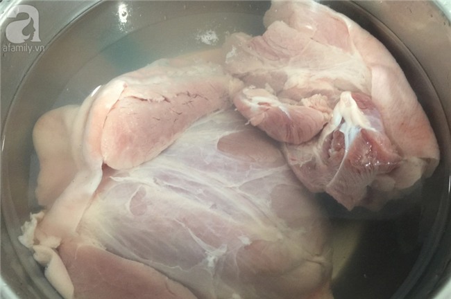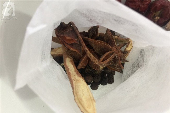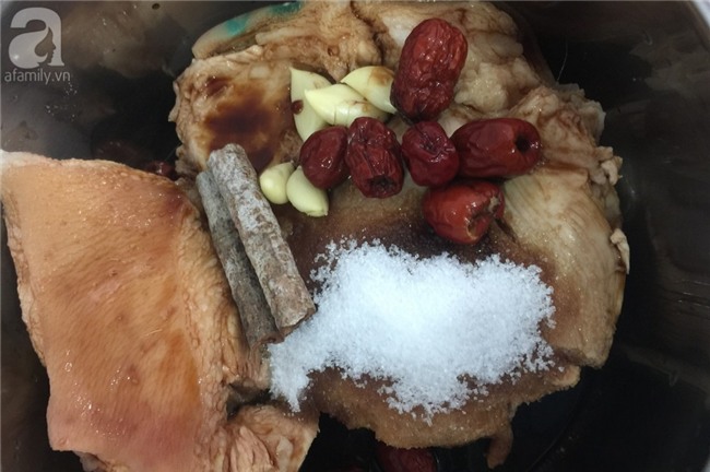 Hầm thịt chân giò cùng túi gia vị đã chuẩn bị với 2l nước sạch trong 3 giờ đồng hồ trên lửa nhỏ.