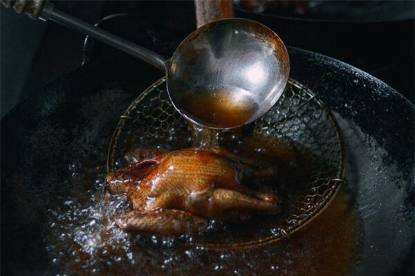 Khi lớp da ngoài đã vàng đều, màu hổ phách thì vớt chim ra để ráo dầu.