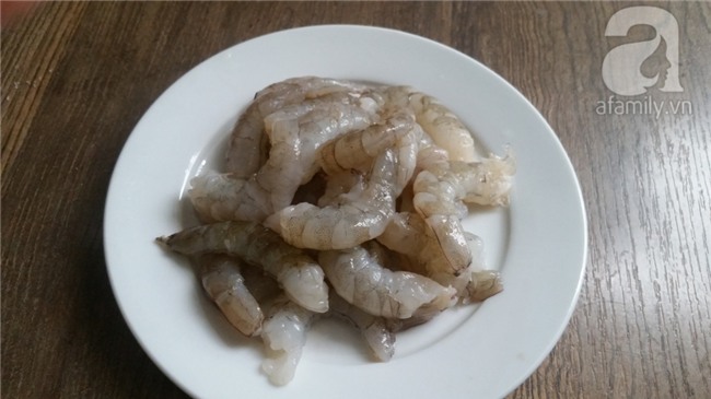Tôm rửa sạch, bóc vỏ, bỏ đầu, rút chỉ ở sống lưng. Ướp tôm với chút gia vị cho ngấm.