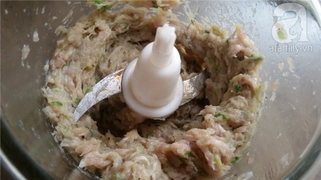 Cho tôm vào máy xay, xay nhuyễn cùng hành lá. Khi tôm nhuyễn, cho thêm thịt xay vào xay để trộn đều hỗn hợp tôm thịt quyện vào nhau.