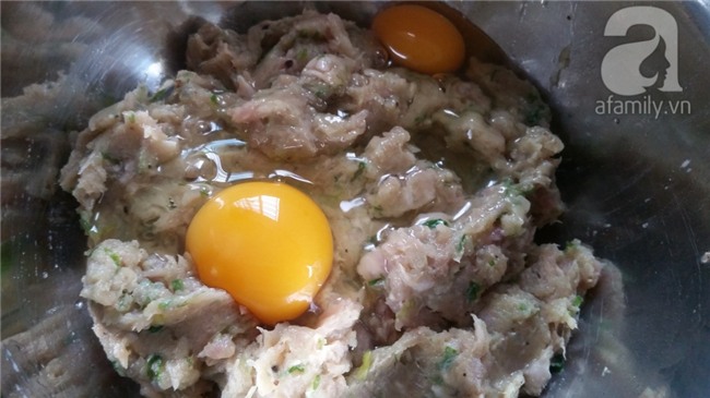 Cho tôm đã xay nhuyễn vào âu, cho thêm 2 quả trứng rồi trộn đều cho trứng quyện vào tôm.