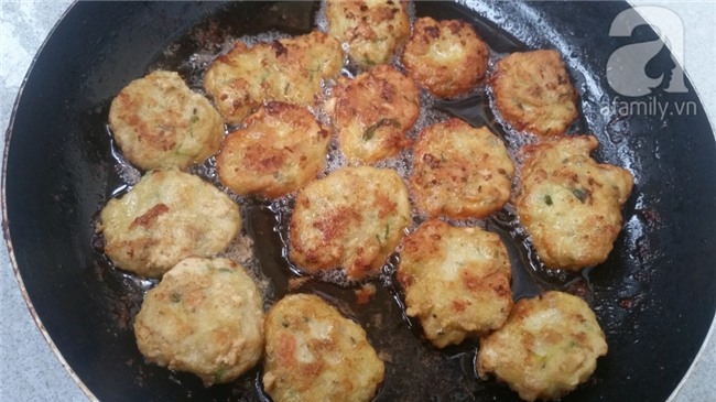 Đặt chảo lên bếp cho nóng, thêm dầu ăn để chuẩn bị chiên chả tôm. Cho từng thìa chả vào chảo dầu nóng ấn dẹt thành hình tròn, để lửa vừa để tránh chả tôm bị cháy. Chiên chả vàng đều 2 mặt rồi cho ra đĩa có lót giấy thấm dầu.
