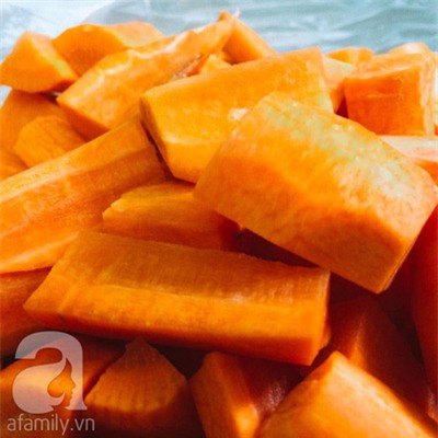 ![]() | ![]() Thái khoai môn, khoai lang, cà rốt thành miếng vuông vừa ăn khoảng 3cm. Gà rửa sạch, chặt miếng vừa ăn |