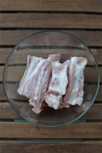 Sườn chặt miếng vừa ăn rồi rửa sạch, thấm khô.