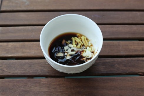 Tỏi bóc vỏ băm nhỏ. Cho tỏi băm vào bát, thêm gốc hành thái nhỏ, nước tương, dầu hào, mật ong, sốt cà chua và hạt tiêu đen vào trộn đều.
