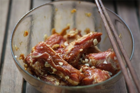 Cho hỗn hợp gia vị vừa trộn vào tô sườn rồi trộn đều sau đó bọc màng bọc thực phẩm lên tô sườn, cho vào tủ lạnh ướp sườn qua đêm.
