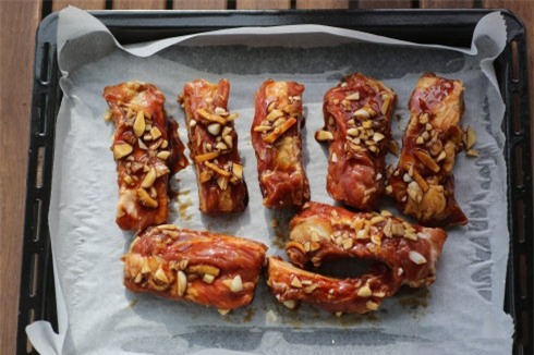 Lấy sườn ra xếp lên khay nướng có lót giấy nướng. Nướng sườn ở 200 độ C, bạn nướng sườn 10 phút rồi lật mặt sườn nướng thêm khoảng 10 phút nữa là sườn chín.