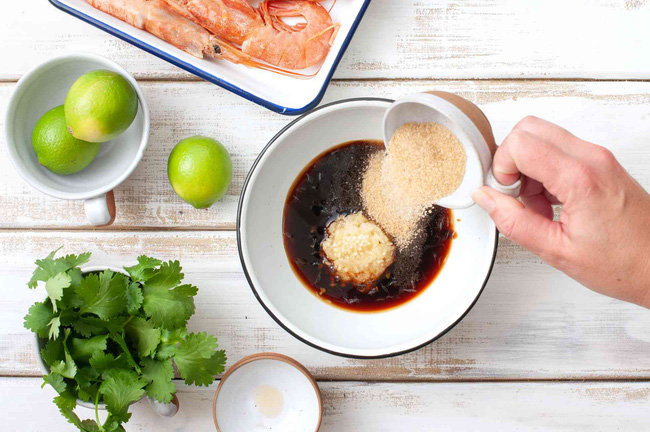 Trộn các thành phần nước sốt gồm nước tương, dầu hào, nước mắm, đường nâu, tỏi băm và nước cốt chanh với nhau trong một cái bát. Để qua một bên.