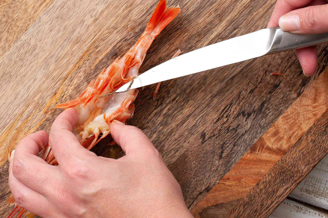 Bây giờ lật úp con tôm lên thớt (sao cho mặt lưng của nó hướng lên trên). Dùng mũi dao nhọn để lấy phần chỉ đen. Dùng lòng bàn tay để làm phẳng tôm bằng cách ấn nhẹ xuống. Khi bạn hoàn thành, tôm phải nằm khá phẳng trên thớt rồi.
