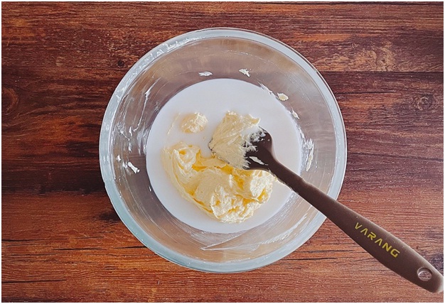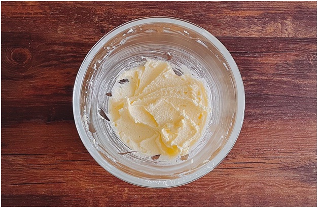 Bơ làm mềm ở nhiệt độ phòng, cho bơ vào thố rồi thêm 80g đường bột, muối vào rồi dùng máy đánh trứng, đánh cho bông và chuyển màu sáng.