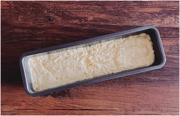 Đổ bột vào khuôn làm bánh đã được chống dính bằng giấy nướng hoặc dùng chổi phết một lớp bơ mỏng lên toàn bộ thành khuôn.